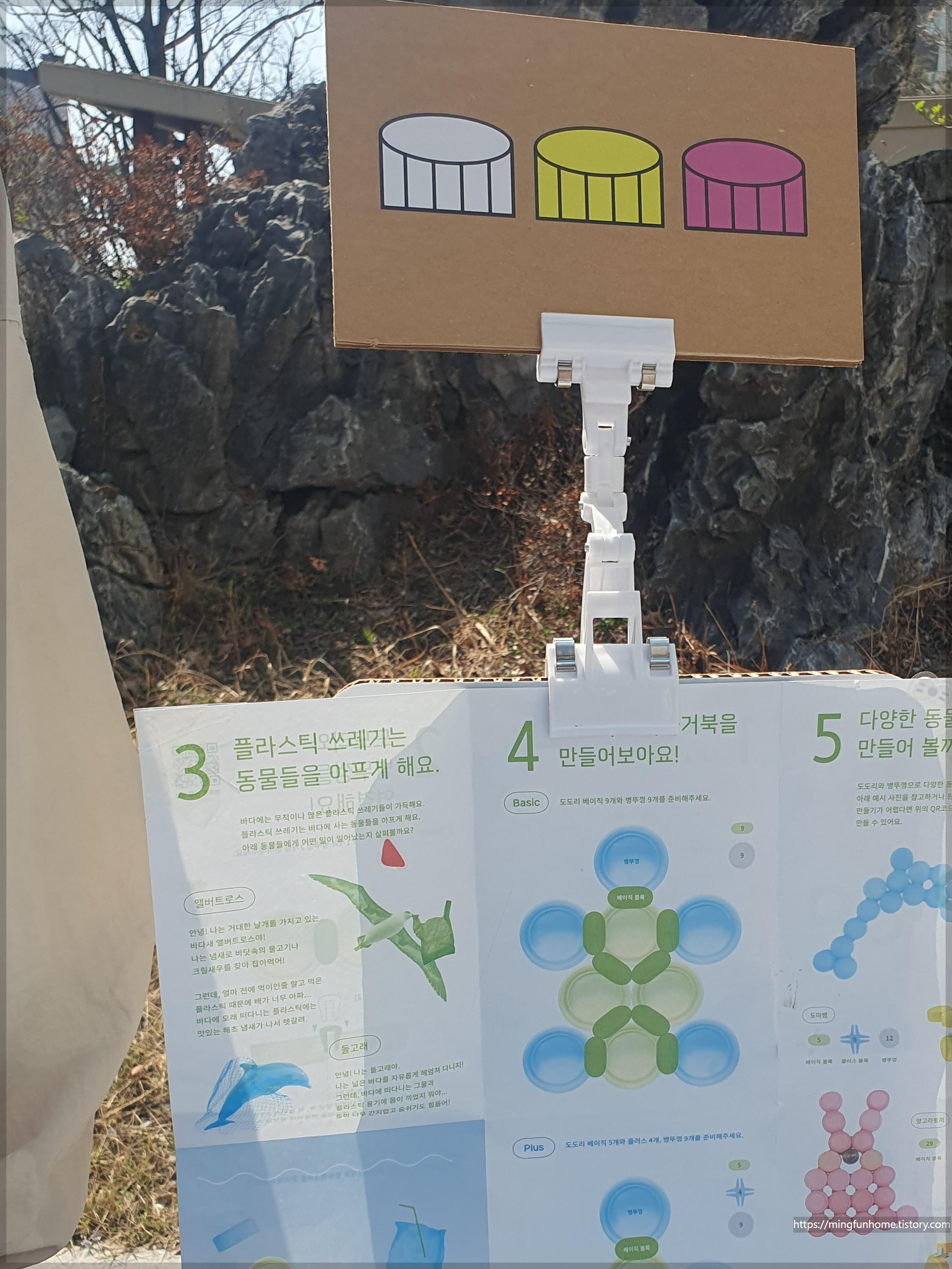 네 번째는 플라스틱 병뚜껑으로 만들기 해보는 체험이었어요.