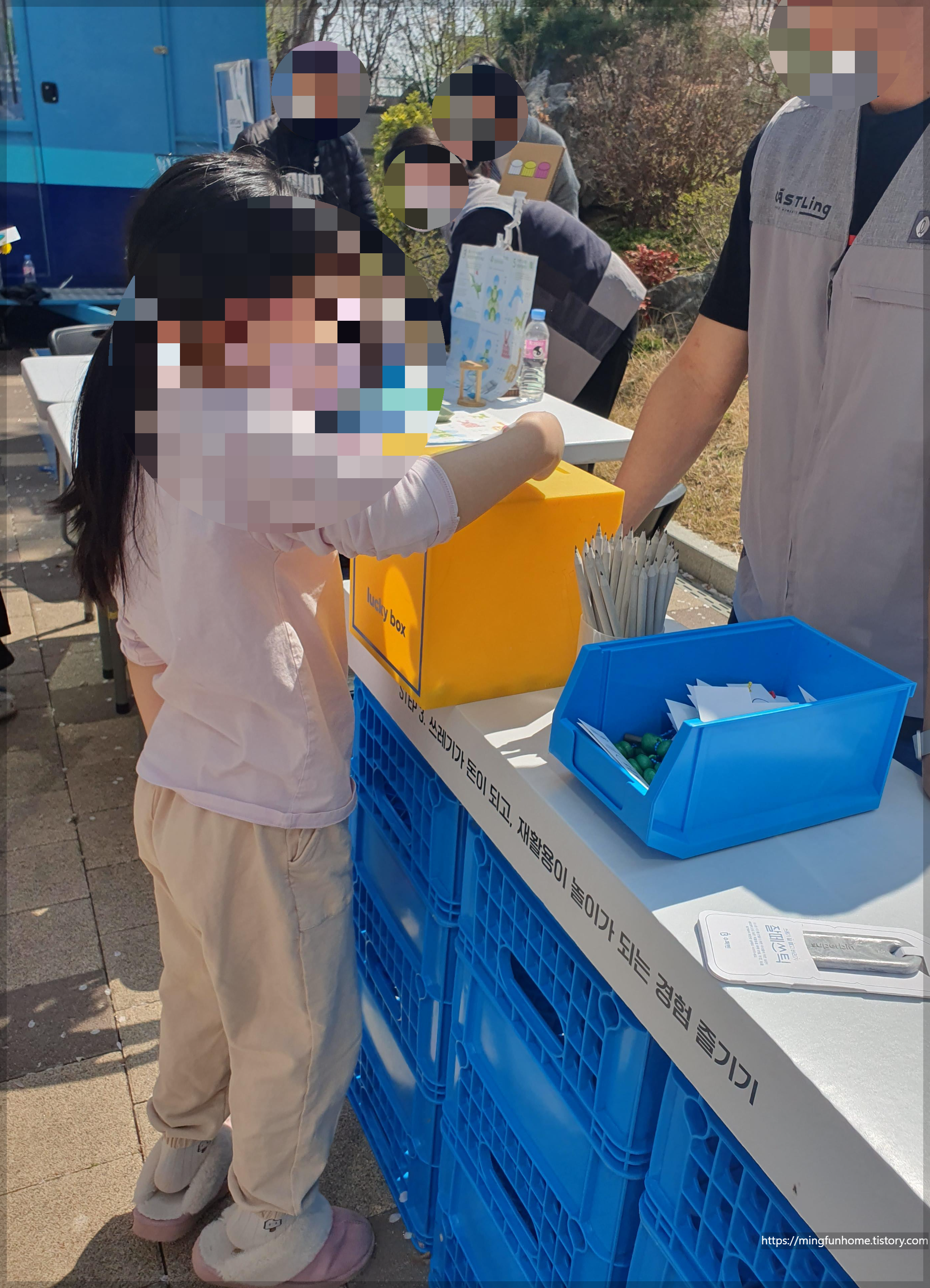 세 번째 체험은 빈플라스틱병을 던져서 농구 골대에 골인시키는 미션이었는데요. 5번의 기회 중 2번 성공하면 선물을 받을 수 있었는데, 실패...또르륵...