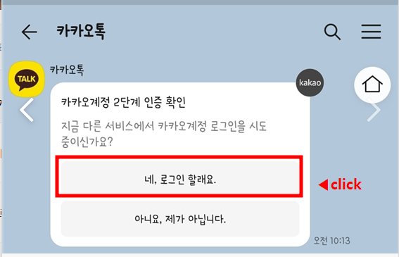 그럼 인증문자가 카카오톡으로 갔다고 화면이 나와요.