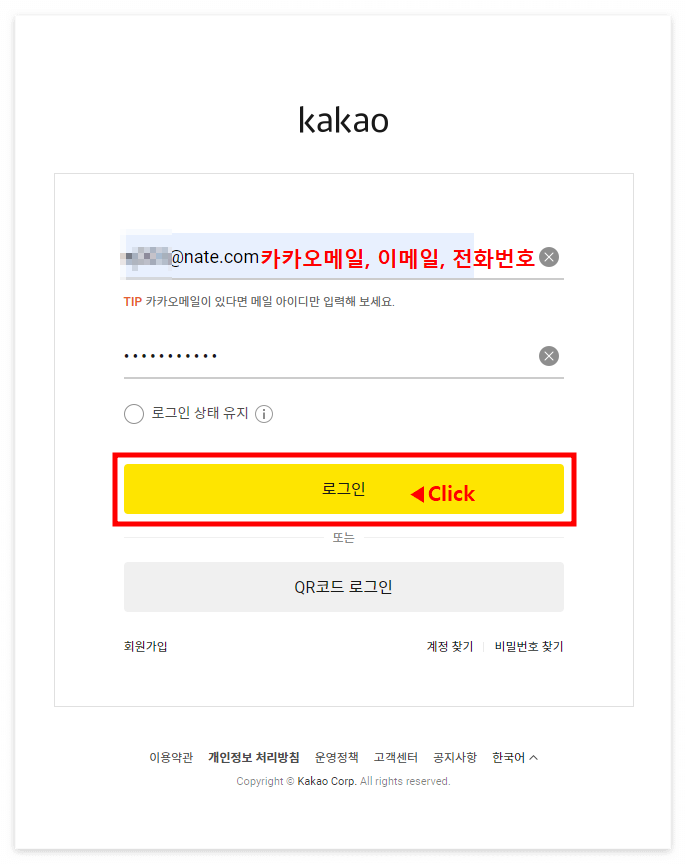 ▼ 카카오메일 or 이메일 or 전화번호 넣고