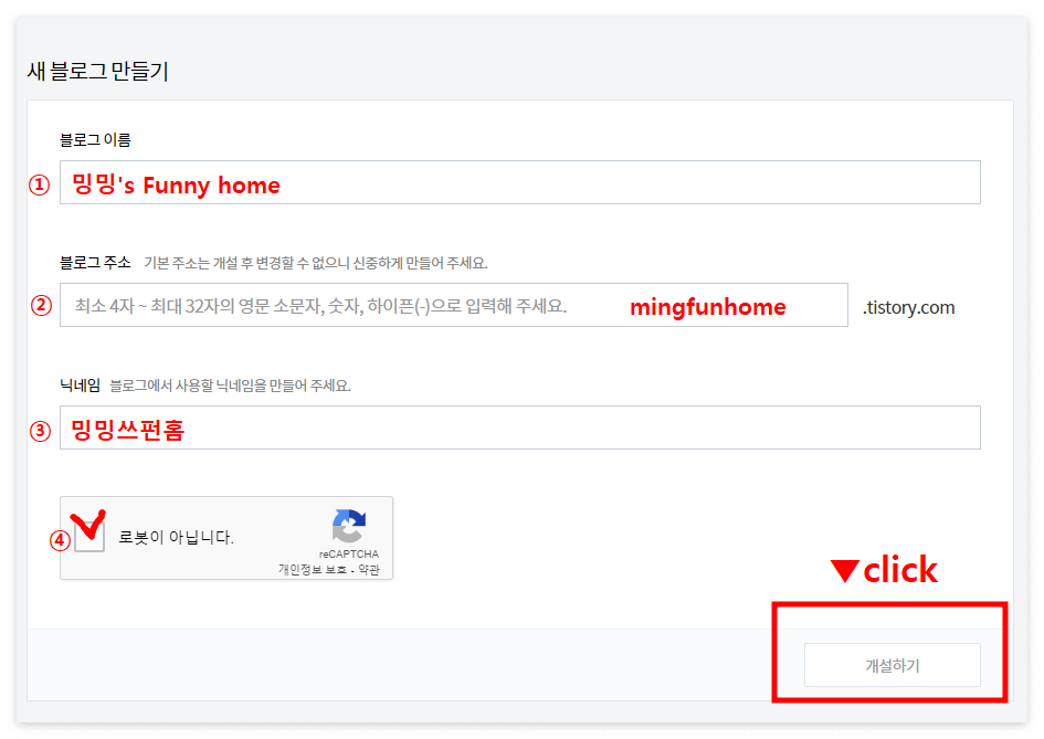 ▼ 로봇이 아닙니다에 체크표시 하고 "개설하기"를 눌러주세요.