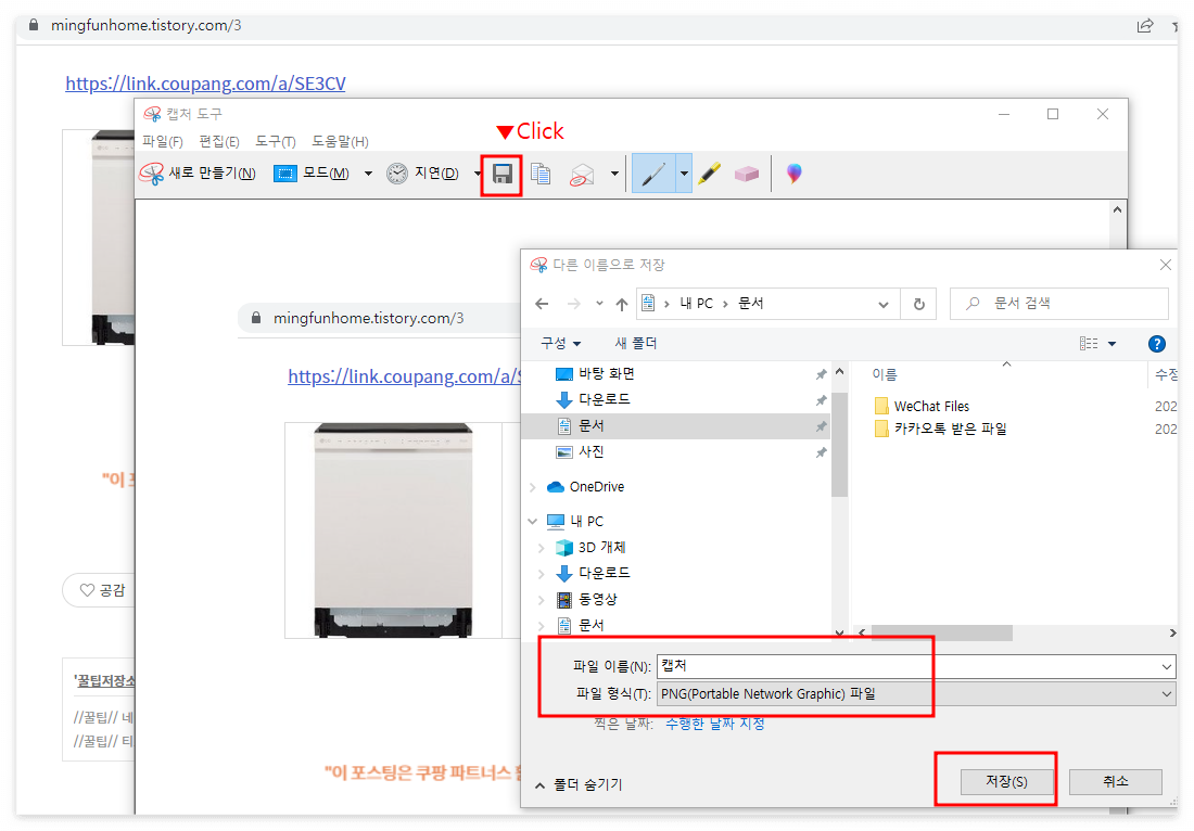 캡처도구의 저장버튼을 누르고